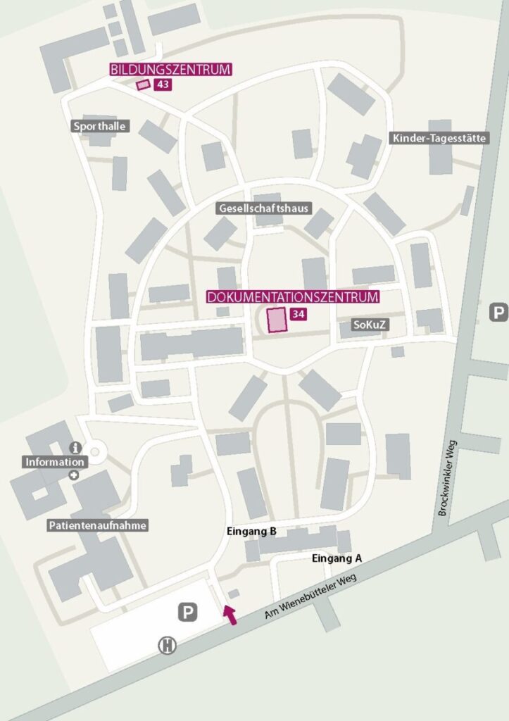 Das DOKUMENTATIONSZENTRUM liegt zentral in der Mitte des Klinikgeländes und ist gut zu finden.